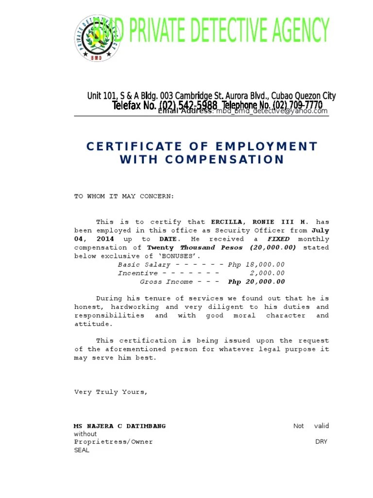 A certificate of employment, also called an employment certificate, is used to verify employment history of a former or current employee. A certificate of employment sample is no more than a single or a few pages long. Employees can also request to specify their salary in the certificate. Your employer to indicate the amount of your salary in the document. How to make a certificate of employment with compensation? This file is free to download anytime, anywhere. To whom it may concern,. The advanced tools of the editor will direct you through the editable pdf template. Hello everyone welcome to q&a with nurse rory at last i was able to . name of employee's annual gross compensation is amount in words pesos .