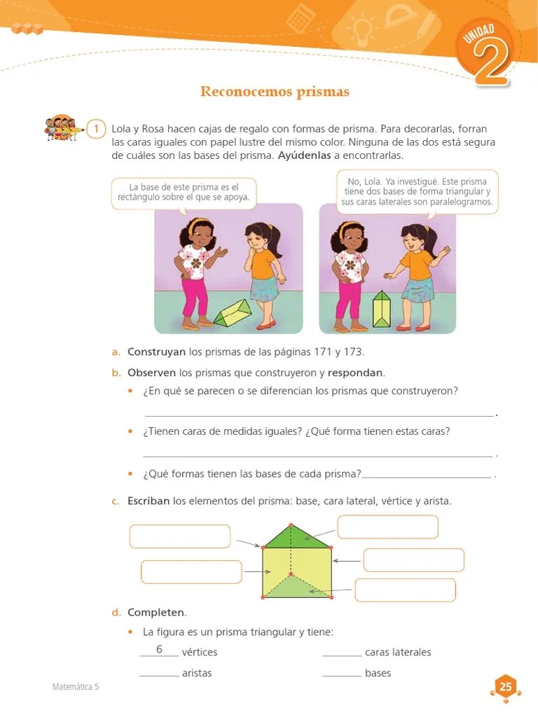 Tiene 5 caras planas, 2 de ellas triangulares que son las bases; Tiene 5 caras planas, 2 de ellas triangulares que son las bases; Hola, aquí les dejo este vídeo en donde explico las partes de un prisma que son las caras, bases, vértices y arista. Tiene 6 caras planas, 2 de ellas cuadrangulares que son las bases;